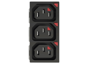 TRU-LOCK IEC 60320 LOCKING C-13 WITH THREE PANEL MOUNT OUTLETS, COMPACT SLIM SIZE DESIGN, UNIVERSAL APPROVALS, 15A-250V, 10A-250V, IMPACT RESISTANT NYLON (PA66), SNAP-IN MOUNT ON 1.5mm PANELS, 6.3 x 0.08mm (0.250 x 0.032"), QUICK CONNECT / SOLDER TERMINALS. BLACK.