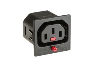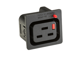 * IEC 60320 C-13 outlet locks onto IEC 60320 C-14 plugs. Red color button unlocks the C-14 plug.