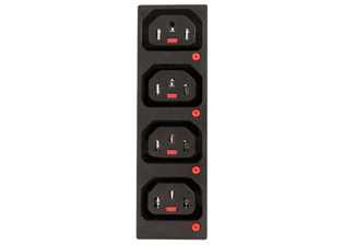 IEC LOCK PA135015BK4, 60320 LOCKING C-13 WITH FOUR PANEL MOUNT OUTLETS, UNIVERSAL APPROVALS, 15A-250V, 10A-250V, IMPACT RESISTANT NYLON (PA66), SNAP-IN MOUNT ON 1.5mm PANELS, 6.3 x 0.08mm (0.250 x 0.032"), QUICK CONNECT / SOLDER TERMINALS. BLACK.