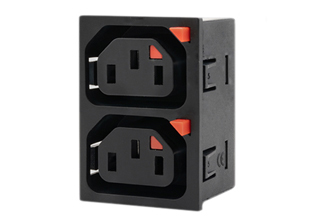 IEC LOCK PA135015BKS2R, 60320 LOCKING C-13 WITH TWO PANEL MOUNT OUTLETS, COMPACT SLIM SIZE DESIGN, UNIVERSAL APPROVALS, 15A-250V, 10A-250V, IMPACT RESISTANT NYLON (PA66), SNAP-IN MOUNT ON 1.5mm PANELS, 6.3 x 0.08mm (0.250 x 0.032"), QUICK CONNECT / SOLDER TERMINALS. BLACK.