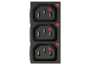 IEC LOCK PA135015BKS3R, 60320 LOCKING C-13 WITH THREE PANEL MOUNT OUTLETS, COMPACT SLIM SIZE DESIGN, UNIVERSAL APPROVALS, 15A-250V, 10A-250V, IMPACT RESISTANT NYLON (PA66), SNAP-IN MOUNT ON 1.5mm PANELS, 6.3 x 0.08mm (0.250 x 0.032"), QUICK CONNECT / SOLDER TERMINALS. BLACK.