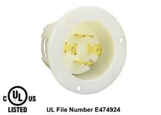 20A-125V NEMA L5-20P LOCKING FLANGED PANEL MOUNT POWER INLET, IMPACT RESISTANT NYLON BODY, SPECIFICATION GRADE. WHITE.